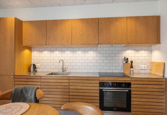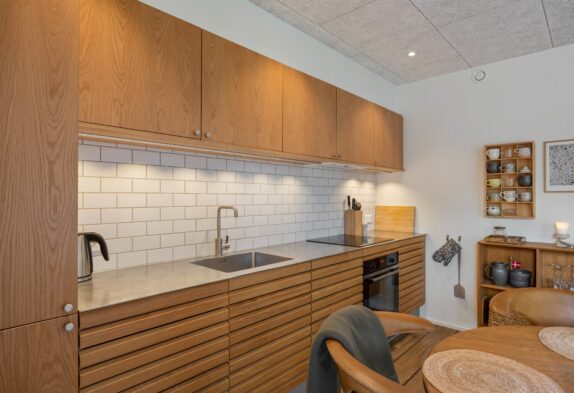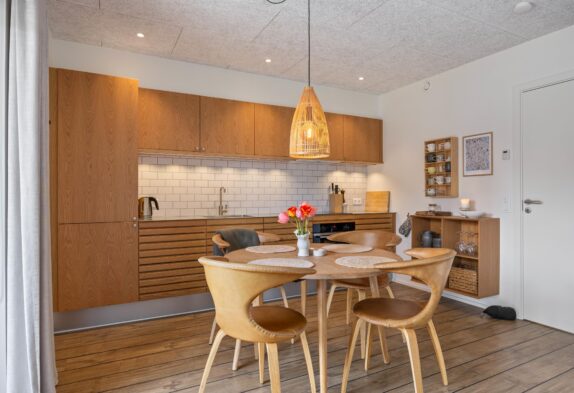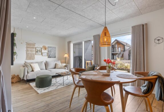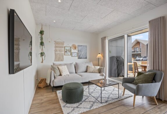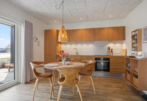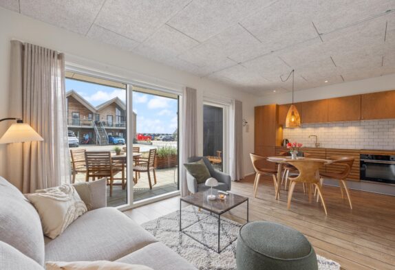 Den moderne ferielejlighed har et lyst og moderne opholdsrum i åben forbindelse med køkkenet. Her kan I nyde mange hyggelige stunder med et spil kort eller en film på sofaen, mens I har en skøn udsigt over Langsand.