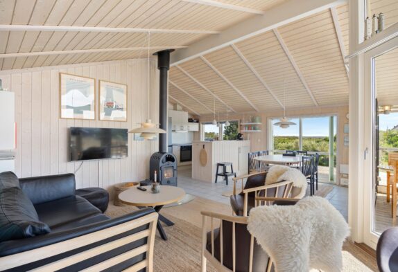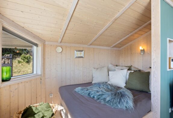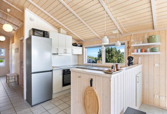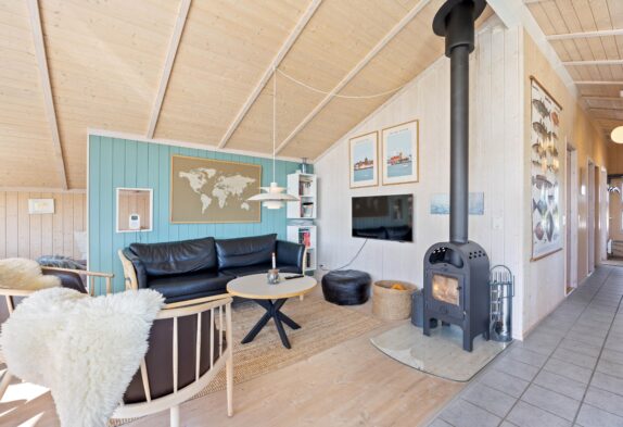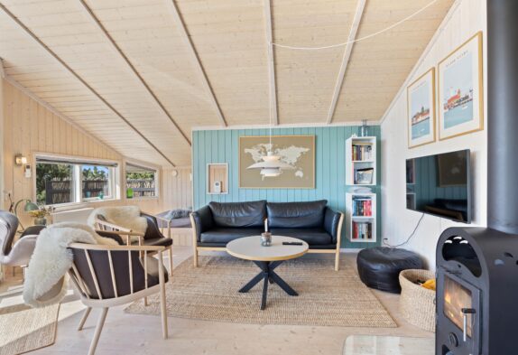 Så snart I træder inden for døren, vil I blive budt velkommen af de lyse og venlige omgivelser. Stue og køkken er i åben forbindelse, og dette store rum er udsmykket med loft-til-kip og et stort vinduesparti, som både sørger for et godt lysindfald og ikke mindst en smuk udsigt ud over fjorden. Sammen med brændeovnen og den venlige indretning skabes der den helt perfekte sommerhusstemning. Hele familien kan samles foran brændeovnen i stuen og se jeres yndlingsfilm eller serie på husets smart-TV. Yderligere er der 2 soveværelser, hvor et er med dobbeltseng og det andet med enkeltmandssenge – dette værelse er oplagt til familiens teenagere. Desuden finder I en alkove i stuen, hvor overnattende gæster kan sove, eller du kan få lidt ro, når du skal læse i din bog.