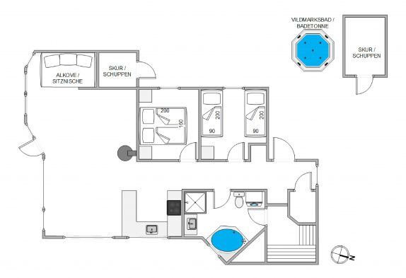 Sommerhuset har flere alsidige og gode terrasser, hvor I kan nyde sommersolen. Terrasserne er også delvist overdækkede, så der er ingen undskyldninger for ikke at tage frokosten med ud i det gode vejr. Terrasserne er selvfølgelig udstyret med diverse havemøbler og en grill, så I kan stege nogle lækre bøffer, eller hvad end I har lyst til. Til sommerhuset er der desuden et redskabsrum og en carport, hvor jeres bil kan stå beskyttet.