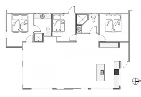 Ferieboligen rummer 3 gode soverum, og et af dem er endda udstyret med elevationssenge. Dertil er der også 2 badeværelser, så der ikke sker kødannelse om morgenen. Sommerhusets vaskemaskine, tørretumbler og opvaskemaskine er gode hjælpere, så I slipper for at bruge for meget tid på den slags og i stedet kan bruge tiden med hinanden. Den energibesparende varmepumpe sørger for at temperaturen indenfor hele tiden er behagelig, uanset vejret udenfor.