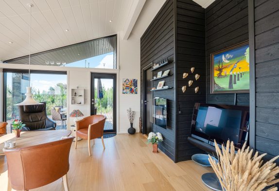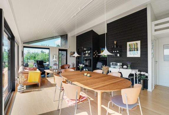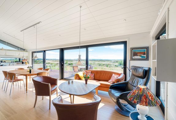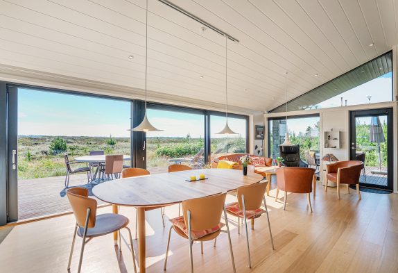Køkken, stue og spisestue er ét stort rum, så I stadig kan være sammen, selvom nogle er i køkkenet og andre slapper af på sofaen. Derfra er der direkte adgang til terrassen, hvor I kan nyde morgensolen. Den vidunderlige udsigt over det store lyngområde kan både nydes fra terrassen og inde fra feriehuset.