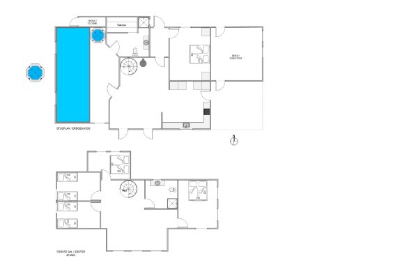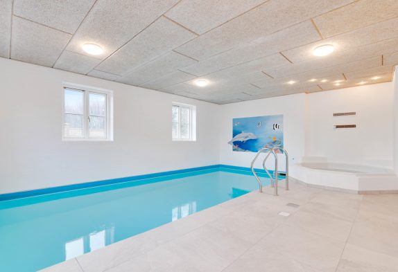 I sommerhuset finder I en lækker poolafdeling med opvarmet klinkegulv. Her kan I lade batterierne op i en spa til 5 personer og en stor swimmingpool med modstrømsanlæg, hvor børnene kan få en dukkert, eller I kan tage nogle svømmebaner med modstrøm. Fra poolafdelingen er der direkte adgang til et badeværelse med en sauna.