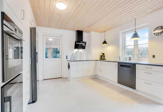 I det store og moderne køkkenalrum finder I en brændeovn, som skaber ekstra god feriestemning. Herfra er der en fin udsigt til området og udearealet.