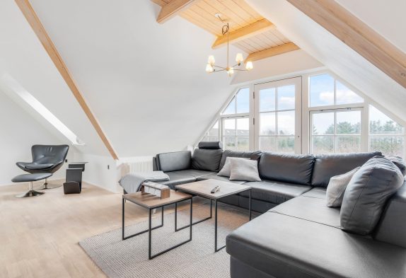 Sommerhuset er beliggende på adressen Tane Hedevej 21 i Blåvand, og med denne placering har I kun 950 meter til stranden og 500 meter til indkøbsmuligheder. I vil med det samme føle jer godt tilpas i de hyggelige omgivelser og den lyse og moderne indretning i huset. Væggene er i lyse farver og lofterne er beklædt med lyst, ludbehandlet fyrretræ. Desuden har sommerhuset hele 2 badeværelser med gulvvarme, så I kommer hverken til at fryse om fødderne eller stå i kø til toilettet. Det ene badeværelse befinder sig i stueetagen og det andet på første sal. De 10 sovepladser fordeler sig på 5 værelser – 3 med dobbeltseng og 2 med enkeltmandssenge. Alle soveværelser på nær ét befinder sig på første sal.