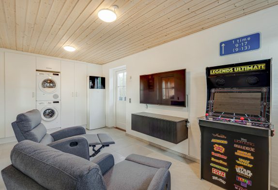 I køkkenet kan I tilberede lækre måltider og få praktisk hjælp fra bl.a. opvaskemaskinen, når servicet efterfølgende skal ordnes. En vaskemaskine og en tørretumbler står i husets bageste rum, og her er også en fladskærm med en spillemaskine installeret, som især børn og barnlige sjæle vil lægge beslag på.