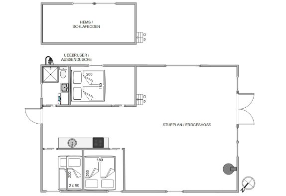 Fra stuen kan I kravle op på en hems, der helt sikker bliver et hit hos børnene. På hemsen er der sovepladser, og derudover rummer sommerhuset 3 soveværelser. 2 af soveværelserne er indrettet med dobbeltseng, mens det tredje er indrettet med en etageseng.
