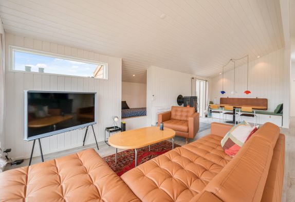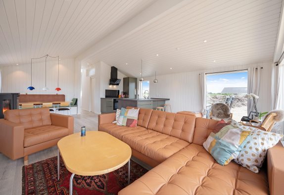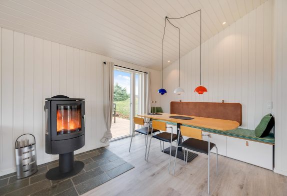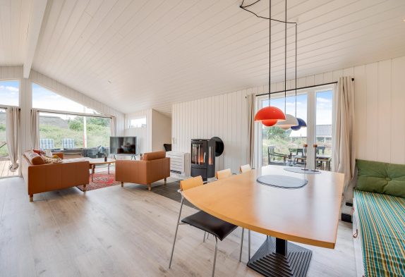 I feriehuset sørger en energivenlig varmepumpe for, at I har et godt indeklima til lave omkostninger. Vil I skrue ekstra op for varmen og den hyggelige feriestemning på de kølige ferieaftener, kan I tænde op i brændeovnen i stuen. På sommerhusets badeværelse er der også gulvvarme, så ingen fryser fødderne.