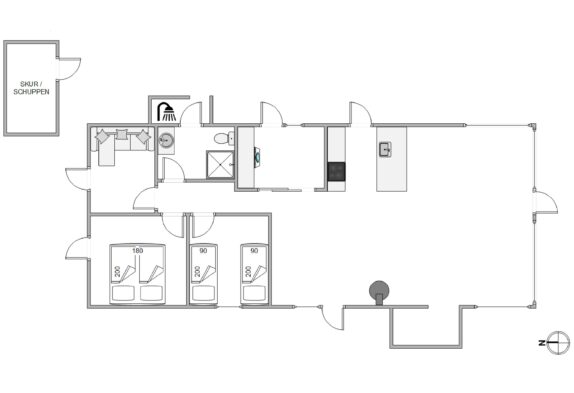 Kun 800 meter fra sommerhuset ligger Vesterhavet, som I hurtigt kan nå til, når I trænger til en frisk gåtur eller en dukkert i vandet. Når I kommer tilbage til sommerhuset, kan I skylle sandet af tæerne under udebruseren. Denne udebruser kan benyttes fra april til november.