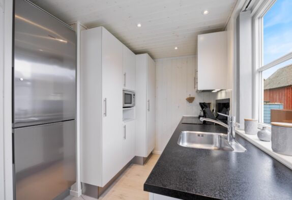 Vinduespartiet ved det hyggelige sofahjørne i sommerhuset skaber et naturligt lysindfald og giver dig en vidunderlig udsigt over det ekstraordinære ferieområde. Køkkenet ligger i åben forbindelse med stuen, og her finder I alt, hvad der skal bruges til at lave et godt måltid. Der er desuden også en opvaskemaskine.