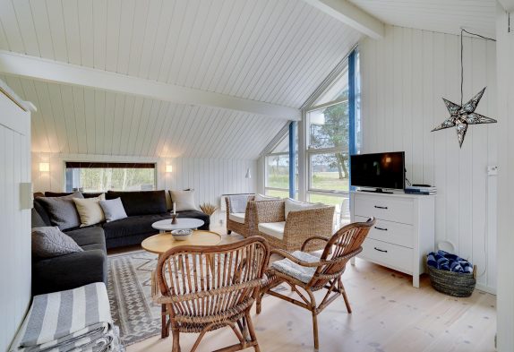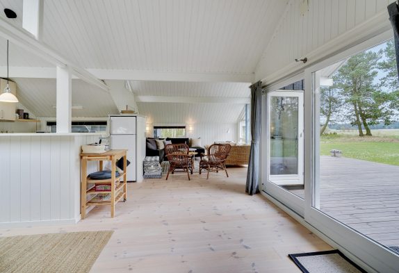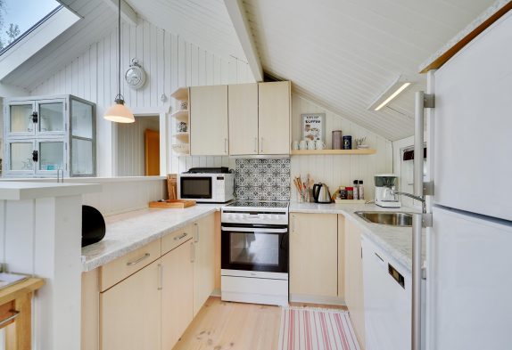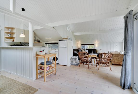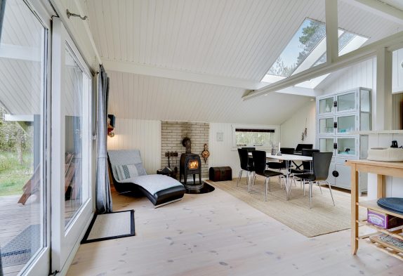 Stuen er kombineret med det åbne køkken og spiseplads. Det fungerer som et knudepunkt for hele familien. Med trægulve og brændeovn udstråler stuen ren hygge. Køkkenet er udstyret med opvaskemaskine, så I ikke behøver at spilde ferietid på at vaske op efter madlavningen. Derudover findes der en varmepumpe i huset.