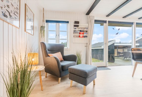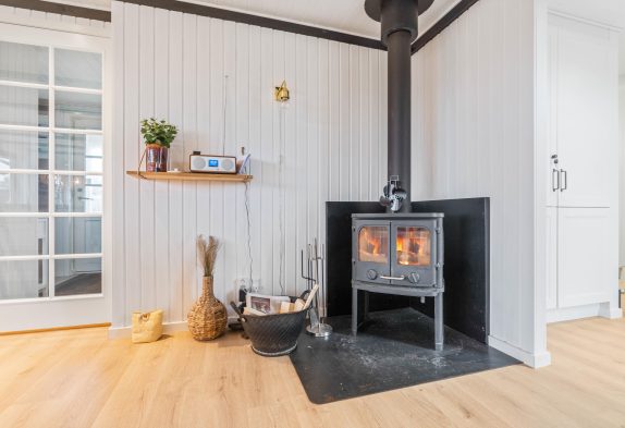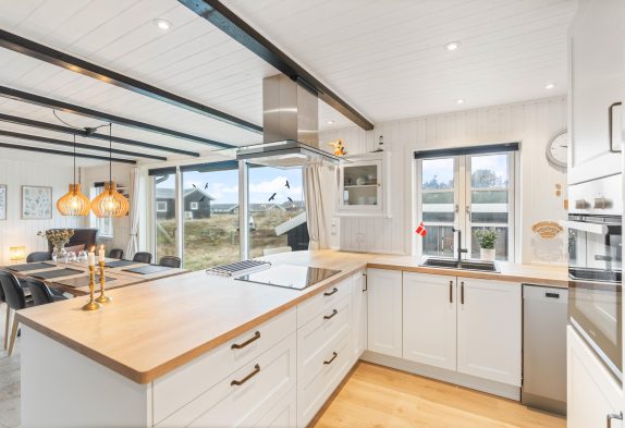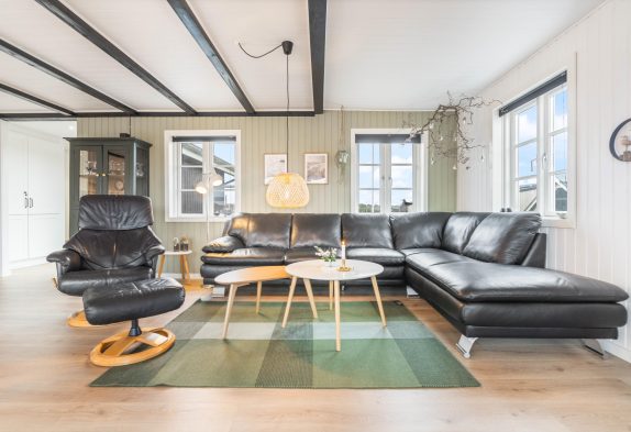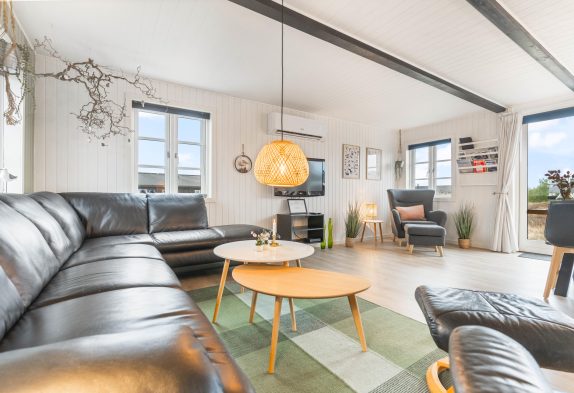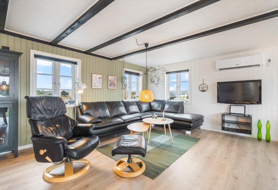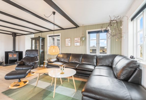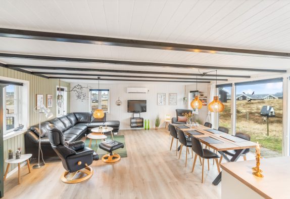 Samlingspunktet i feriehuset er det rummelige opholdsrum, der ligger i åben forbindelse med køkkenet. Her er der plads til hele familien, som kan samles til en hyggelig aften med et spil kort, mens brændeovnen knitrer i baggrunden. Her er også en varmepumpe, som I med fordel kan benytte jer af.