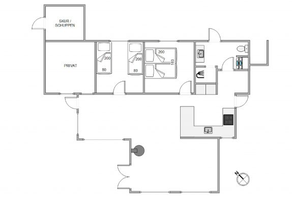 Den store træterrasse løber hele vejen rundt om sommerhuset og er absolut et af feriens højdepunkter. De høje klitbanker rundt om naturgrunden giver jer en læfyldt beliggenhed, og terrassen har også en overdækket del, der er oplagt at tage i brug, når I vil fyre op i grillen på en lun sommeraften. Sommerhuset er udstyret med en gasgrill, så I hurtigt kan tilberede et lækkert feriemåltid. Terrassen gemmer desuden på en udebruser. Udebruser er lukket fra 1. november til 1. april på grund af frosten.