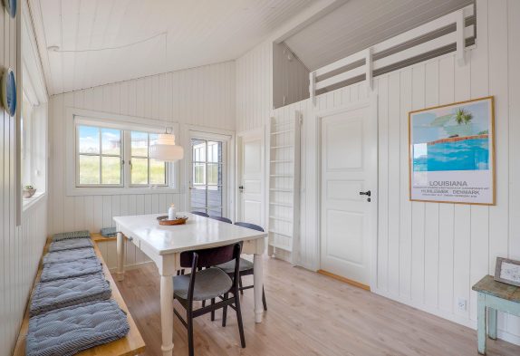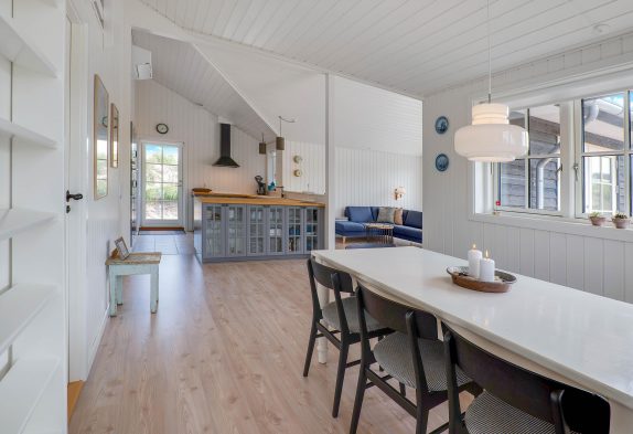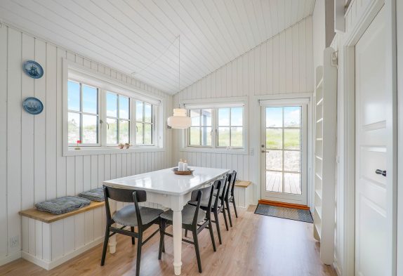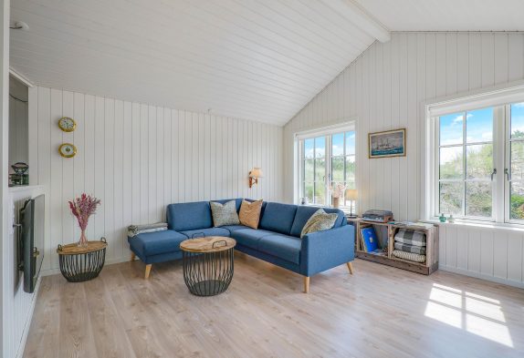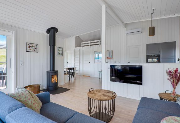 Hyggelige feriestunder får I med garanti masser af i opholdsrummet, der forener både køkken, spisestue og stue. I de kølige måneder står brændeovnen i sofahjørnet klar til at sprede hyggelig stemning og god varme. Omvendt byder sommerhalvåret helt sikkert på mange dejlige solskinsdage, og her er det meget praktisk, at I har flere udgange til terrassen.
