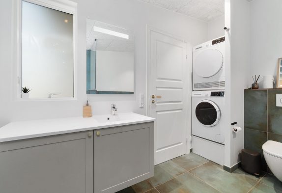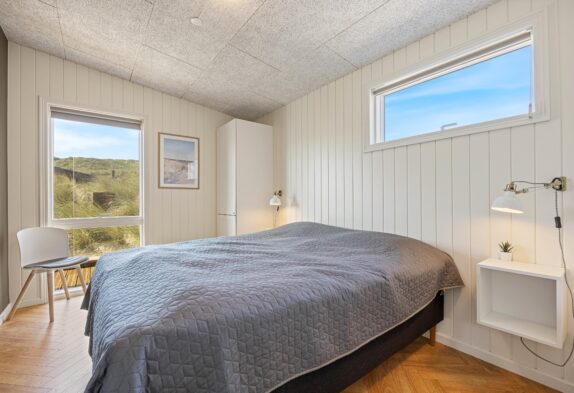 Feriehusets 8 sovepladser er fordelt på 4 rummelige værelser, der alle er indrettet med komfortable dobbeltsenge. Alle værelser har desuden mørklægningsgardiner. Der er 2 badeværelser i sommerhuset, så der ikke opstår kø om morgenen. Begge er med gulvvarme, og på det ene finder I desuden sommerhusets sauna og et badekar. Her er også en vaskemaskine og tørretumbler, så I kan vaske tøj og håndklæder i løbet af ferien.
