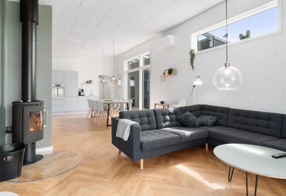 Ved sofahjørnet er der en brændeovn, som både spreder varme og ekstra hyggelig feriestemning. I kan med fordel også bruge varmepumpen til at holde temperaturen i rummet behagelig.