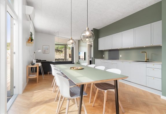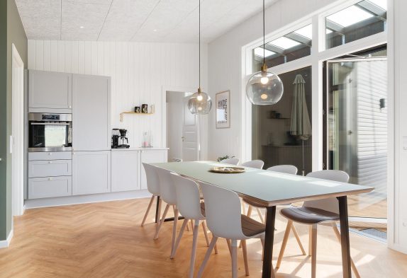 Hele feriehuset er moderne indrettet og fremstår lyst og indbydende. Her er tænkt på selv den mindste detalje, og det store vinduesparti ved spisebordet skabet et fantastisk lysindfald.