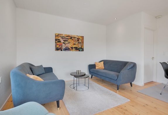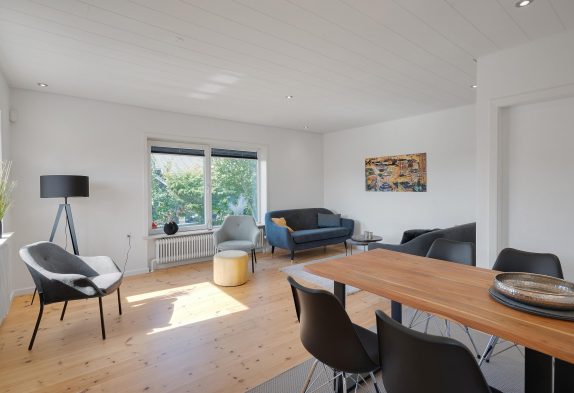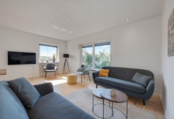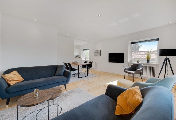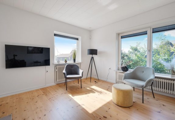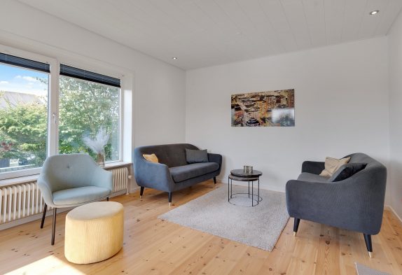 Feriehuset ligger lidt tilbagetrukket fra landevejen og kan danne udgangspunkt for mange udflugter i området langs den jyske vestkyst. Selve feriehuset har en hyggelig og venlig indretning, hvor køkkenet er i åben forbindelse med stuen. Her kan I sidde og slappe af foran tv’et og planlægge feriens aktiviteter.