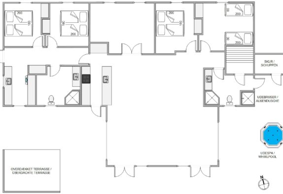 På sommerhusets 175 kvadratmeter er der god plads til alle feriegæster. De 8 sovepladser i sommerhuset fordeler sig på 4 gode soveværelser – 3 af soveværelserne har dobbeltseng, og det fjerde soveværelse har 2 enkeltsenge. Desuden er der 2 badeværelser i feriehuset, så ingen skal stå i kø om morgenen.