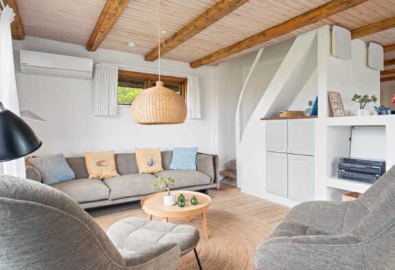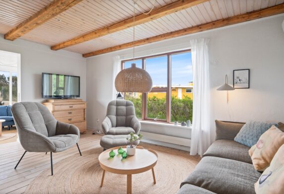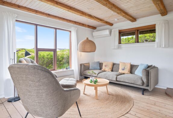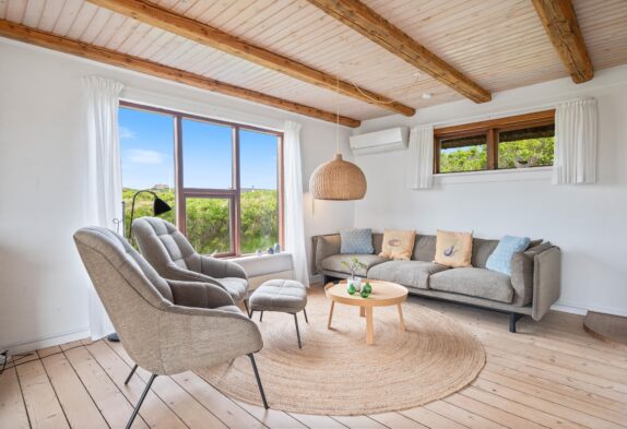 Sommerhuset på Plantagevej 21 er blevet renoveret i 2020, og de 140 kvm emmer af klassisk sommerhusindretning med bjælkelofter og store vinduespartier, hvor man kan sidde og nyde udsigten til sommerhuslandskabet – især fra udestuen.