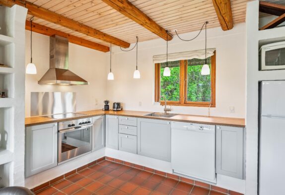 Sommerhuset er fordelt på 3 soverum med enkeltsenge (90 x200), og det ene soverum har udgang til en lille balkon. Dertil findes ekstra sofa i det tilhørende anneks. Køkkenet og stuen er integreret, så alle kan følge med i både madlavning og planlægningen af feriens aktiviteter. Derudover rummer sommerhuset også over alle de praktiske bekvemmeligheder, der letter de praktiske gøremål på ferien, såsom vaskemaskine, tørretumbler og opvaskemaskine. Dertil er der desuden 2 fladskærms-tv i feriehuset samt gratis fibernet, så den hurtige internetforbindelse på ferien er sikret.