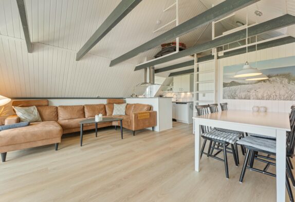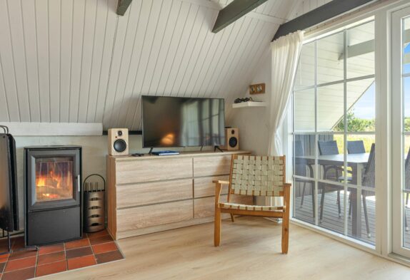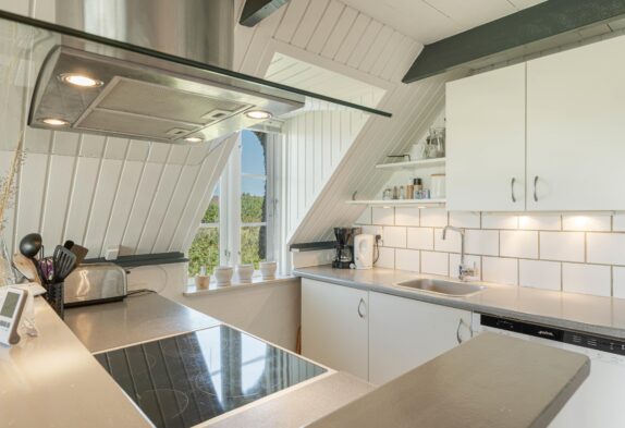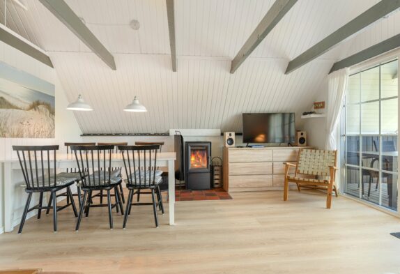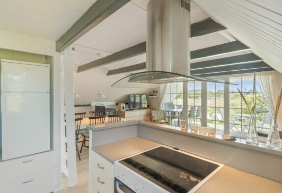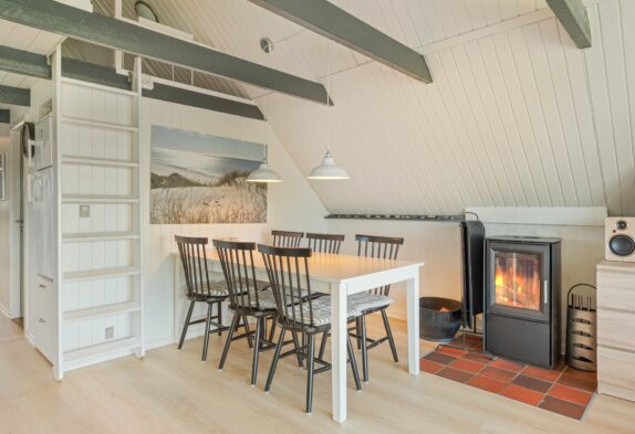 Sommerhusets hjerterum er det åbne køkken, som er i direkte forbindelse med stuen. Her er det oplagt at planlægge feriens aktiviteter og deltage i madlavningen. Det er også her, I finder sommerhusets brændeovn, som bidrager til at skabe den ægte sommerhusstemning. Udover brændeovnen er der gulvvarme på badeværelset samt en energivenlig varmepumpe, der sørger for et behageligt indeklima. Når I har været ude og nyde den skønne jyske natur og er blevet blæst godt igennem ved Vesterhavet, kan I slutte dagen af med en tur i spaen og efterfølgende sauna, som giver en følelse af wellness på ferien.