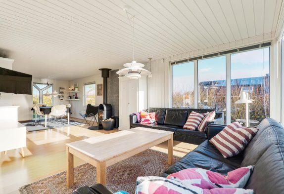 Hjertet i feriehuset er stuen, der ligger i åben forbindelse med køkken og spiseplads, som tilsammen danner alrummet. Her kan I samles til at lave mad, spise, spille spil og se film – og selv hvis I laver forskellige ting, kan I nyde hinandens selskab. Brændeovnen fuldender feriestemningen med sine knitrende flammer og varme.