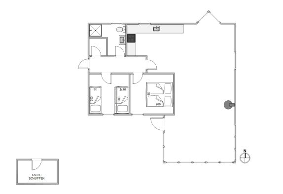Feriehuset, der er 75 kvadratmeter stort, er indrettet med 2 skønne soveværelser. Det ene er indrettet med en dobbeltseng, og det andet er indrettet med en enkeltseng og en etageseng – det oplagte soveværelse til børnene. Desuden er der 1 badeværelse med gulvvarme i sommerhuset.