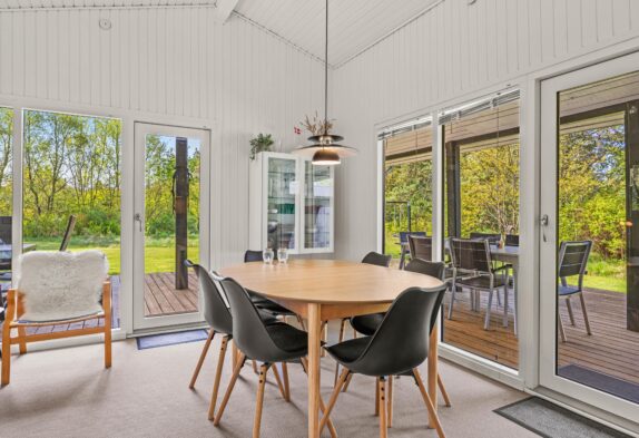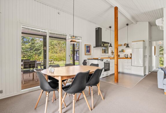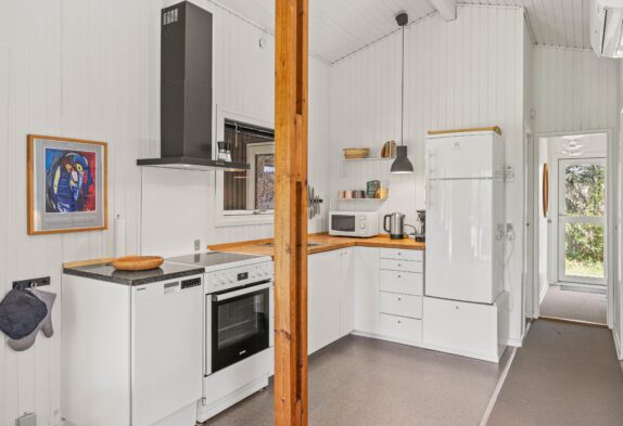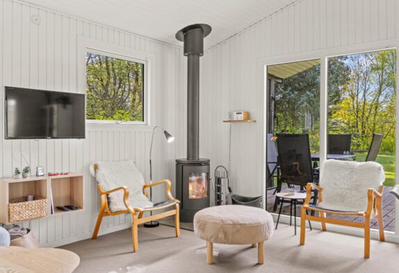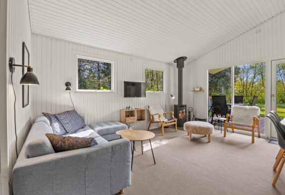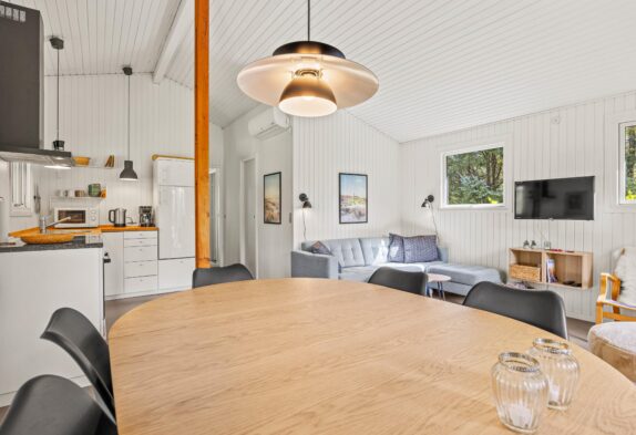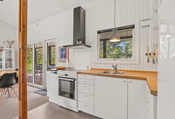 Så snart I træder inden for døren, mærker I den hyggelige sommerhusstemning. Køkken, spisestue og stue er samlet i ét rum, så her kan familien samles og nyde hinandens selskab. I køkkenet finder I en praktisk opvaskemaskine, så I hurtigt kan komme tilbage til hyggen eller ud på dagens eventyr. I sofaområdet kan hele familien samles om en god film. Her sætter den varme brændeovn prikken over i’et og indbyder kun til en ekstra god feriestemning.