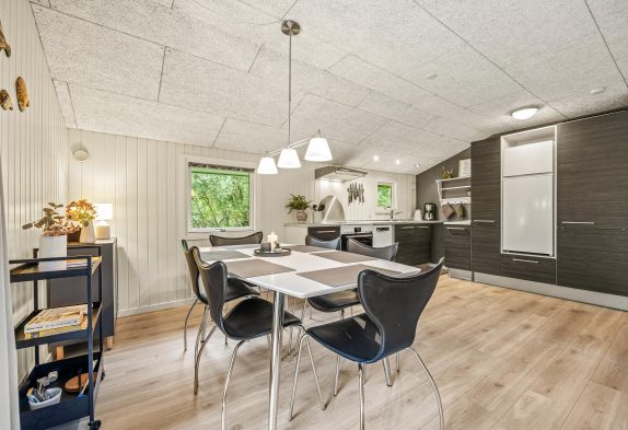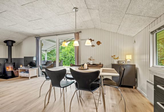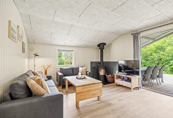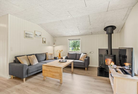 Sommerhusets alrum bliver jeres store samlingspunkt på ferien, hvor I kan tilbringe mange hyggelige stunder sammen. Om I sidder i sofaerne, ved spisebordet eller laver mad i køkkenet, kan I nyde hinandens selskab. I hjørnet står der en brændeovn, der fuldender den hyggelige feriestemning og spreder dejlig varme.