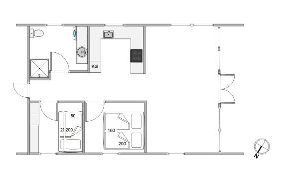 Foruden alrummet finder I på sommerhusets 50 kvadratmeter også 2 soveværelser, der er indrettet med henholdsvis en dobbeltseng og en etageseng. Derudover er der et badeværelse med gulvvarme i feriehuset.