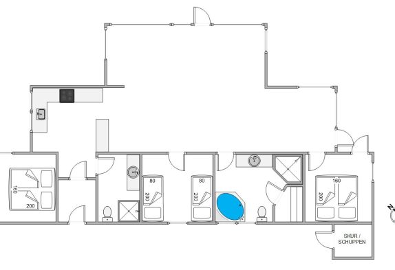 Sommerhuset råder over 2 badeværelser med gulvvarme, hvoraf det ene er udstyret med både spabad og sauna – Så tænd op i saunaen efter en dejlig gåtur ved Vesterhavet og lad varmen trænge helt ind i kroppen, wellness for krop og sjæl.