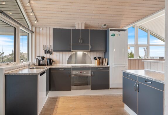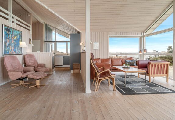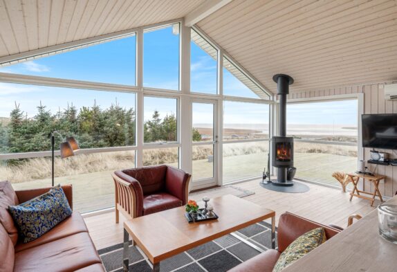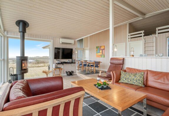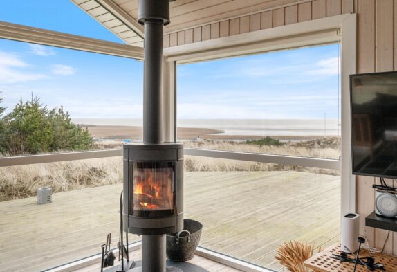 Straks I træder ind i sommerhusets opholdsrum, springer det store vinduesparti jer i øjnene. Naturligt lys og en uimodståelig smuk udsigt over Ringkøbing Fjord og det omkringliggende hedeområde sørger for en følelse af velvære. Træk vejret dybt ned i maven, lyt til Vesterhavet og sug hvert øjeblik til dig. Her vil I hurtig finde jer godt tilpas i sofaen, mens brændeovnen knitrer og spreder varme samt en ekstra hyggelig feriestemning. I feriehuset finder I en energibesparende varmepumpe, som også kan køle på de varme sommerdage.
