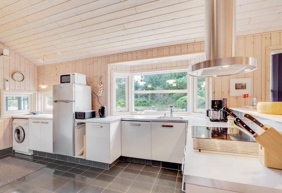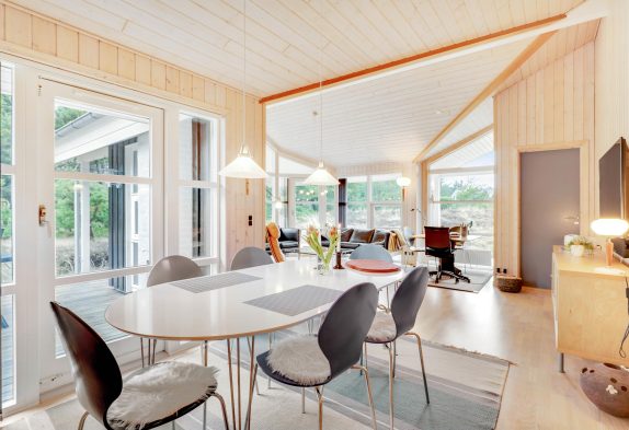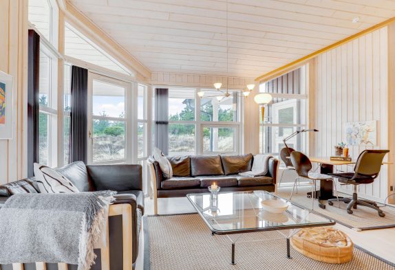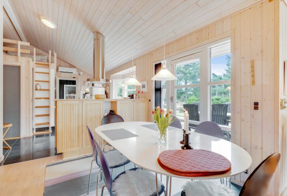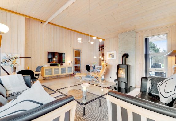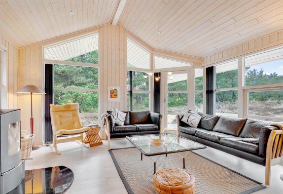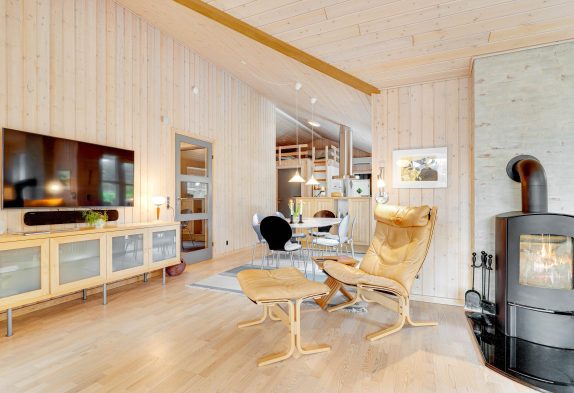 De store vinduespartier sørger for rigeligt med lys i ferieboligen, og der er en dejlig udsigt til den grønne naturgrund. Skulle det blive en smule køligt om aftenen i den danske sommer, kan I tænde op i brændeovnen, der også bidrager til den helt rigtige ferieatmosfære. Alternativt sørger den omkostningsbesparende varmepumpe for et behageligt indeklima.
