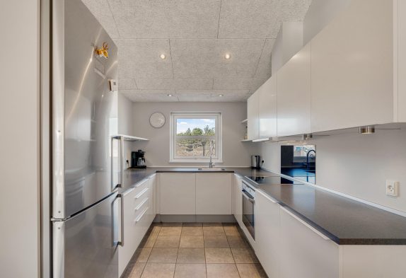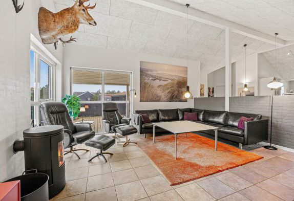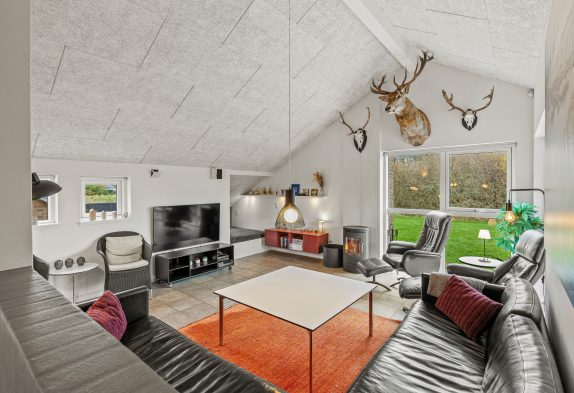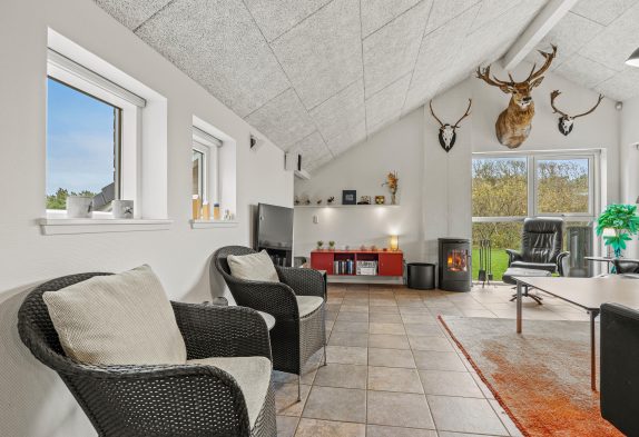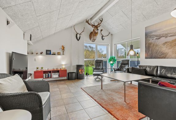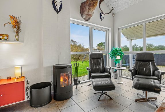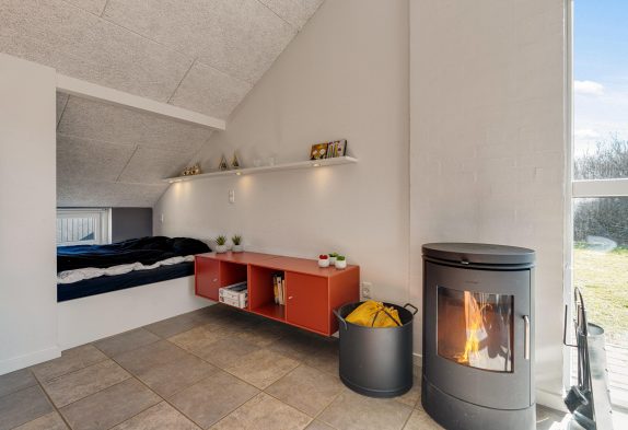Sommerhusets køkken, stue og spiseplads ligger i åben forbindelse og danner tilsammen alrummet, som vil blive jeres store samlingspunkt på ferien. Her kan I være sammen om at lave mad, spille spil og se film. Brændeovnen sørger for at sprede en dejlig varme og er samtidig med til at fuldende den hyggelige feriestemning. I stuen har I desuden gulvvarme.