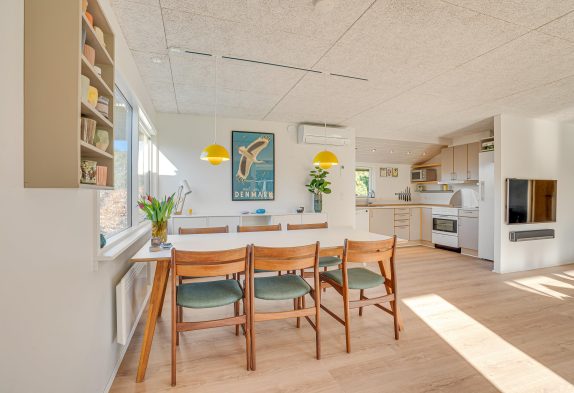 Det store samlingspunkt i sommerhuset er alrummet, der forener køkken, stue og spiseplads. Her kan I nyde hinandens selskab, selv når nogle står for madlavningen i køkkenet, og andre ser film i stuen – alt imens sørger brændeovnen for at sprede varme og hygge. Den lyse indretning i rummet bliver på bedste vis komplementeret af det skønne lysindfald, der tilsammen skaber en fantastisk ferieatmosfære.