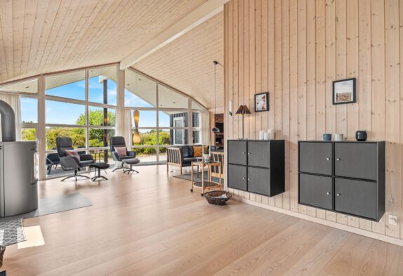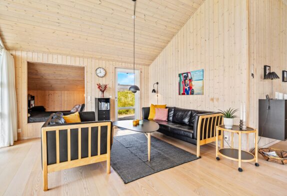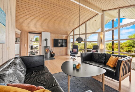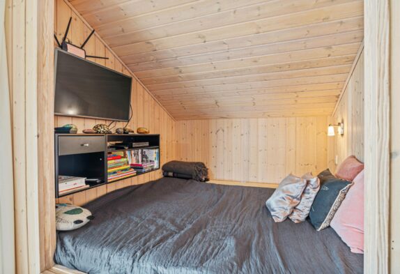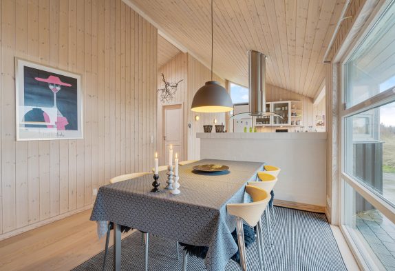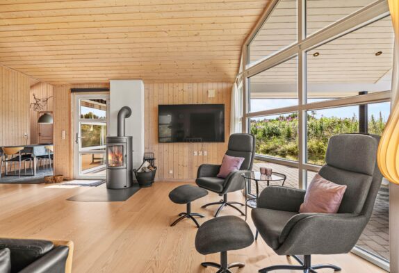 Det store samlingspunkt i sommerhuset er stuen, der ligger i åben forbindelse med spisestue og køkken. Her kan I samles til mange hyggelige feriestunder – blandt andet med film, som I kan streame via Chromecasten – eller til atnyde en stille stund med en god bog i alkoven. Pilleovnen i stuen sætter prikken over i’et med sin knitren og varme. I stuen har I desuden gulvvarme, så ingen kommer til at fryse fødderne.
