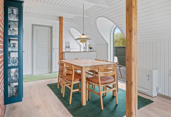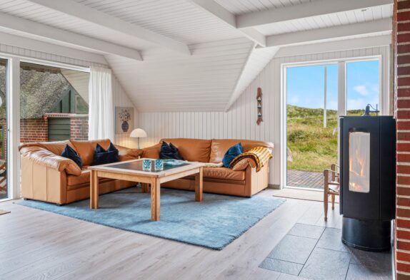 Den energibesparende varmepumpe sørger for en behagelig temperatur i feriehuset, mens brændeovnen både spreder varme og hyggelig feriestemning.