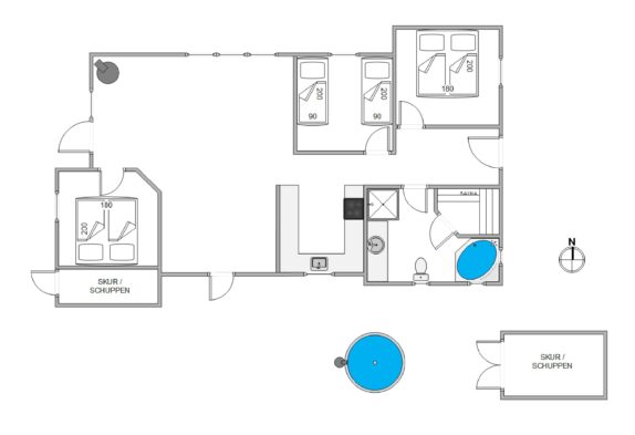 De 3 soveværelser i sommerhuset byder på komfort og ro. 2 af disse er indrettet med dobbeltsenge, hvor det sidste har 2 enkeltsenge, hvilket giver jer fleksibilitet og masser af plads til afslapning. Badeværelset er veludstyret med gulvvarme, tømmespa og en sauna, så I kan nyde ren afslapning og fornyet energi efter en dag fyldt med aktiviteter.
