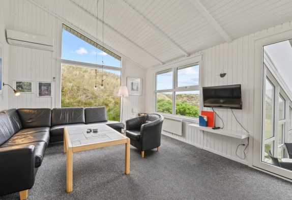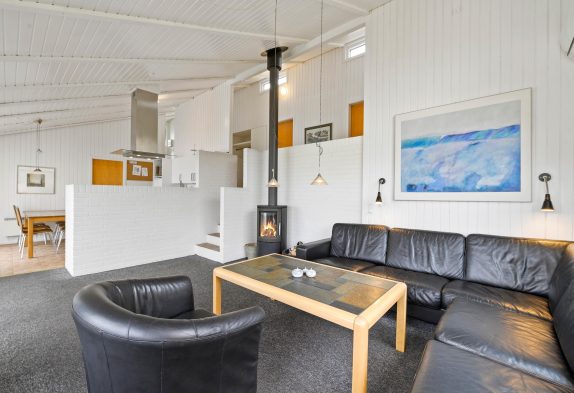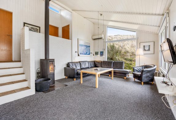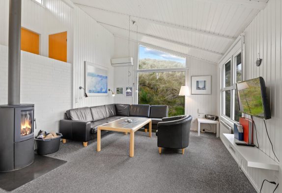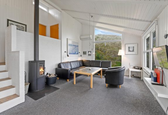 I forbindelse med køkkenet ligger stuen, som indbyder til mange hyggelige stunder i familiens selskab. Her kan I tænde op i brændeovnen, som sætter prikken over i´et for feriestemningen. I kan med fordel også benytte jer af den energibesparende varmepumpe til at holde en behagelig temperatur.