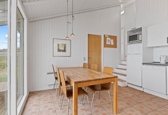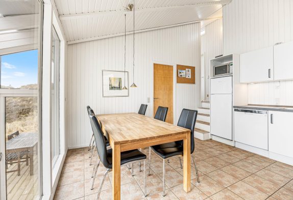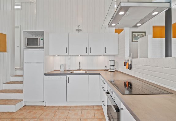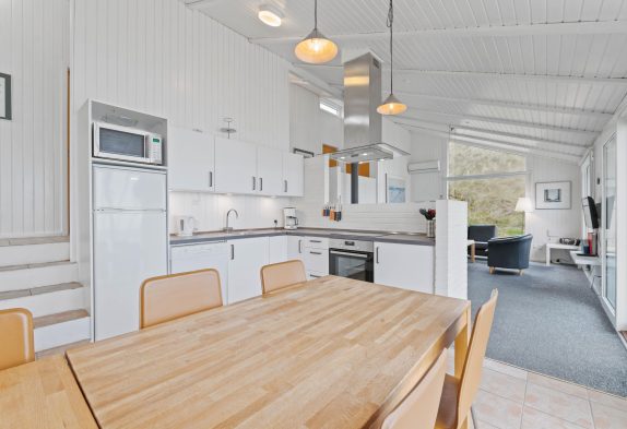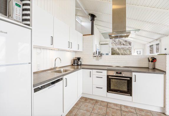 Sommerhuset har et lyst og praktisk udstyret køkken med alt, hvad I skal bruge til at tilberede et lækkert måltid; herunder blandt andet opvaskemaskine og induktionskomfur.