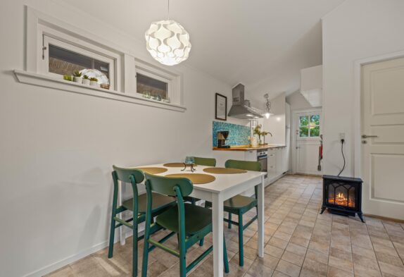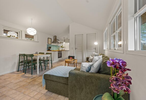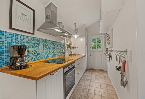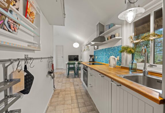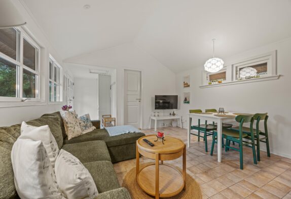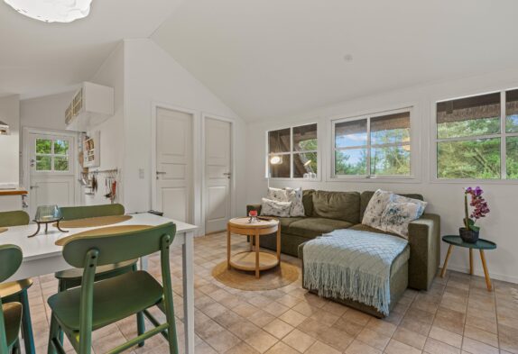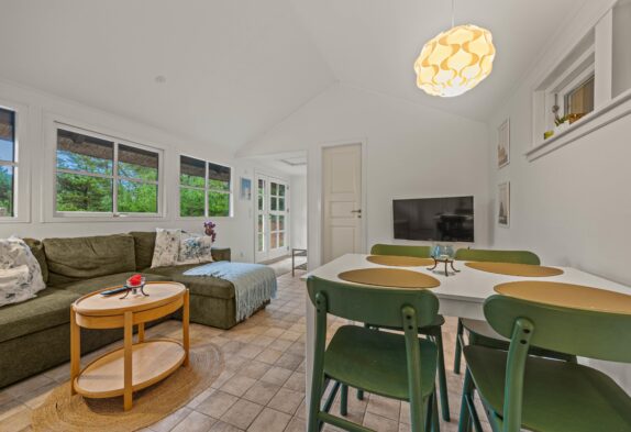 Sommerhusets køkken ligger i åben forbindelse med stuen, der tilsammen danner alrummet, som er sommerhusets hjerte. Her kan I være sammen om madlavningen, og efterfølgende kan I samles til et sjovt spil eller en god film, mens opvaskemaskinen klarer opvasken i køkkenet.