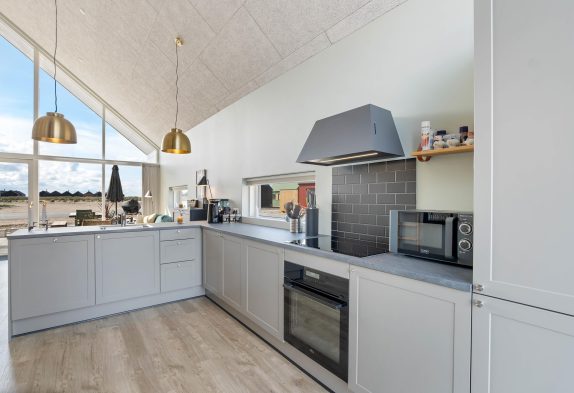 Køkken, spiseplads og stue ligger i åben forbindelse og har store vinduespartier, som skaber et naturligt lysindfald i hele rummet. Køkkenet er praktisk udstyret med opvaskemaskine, mikrobølgeovn og induktionskomfur.