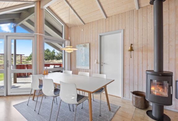Hjertet i feriehuset er alrummet, hvor køkken, stue og spiseplads ligger i åben forbindelse. Her kan I nyde mange dejlige feriestunder sammen – og er der nogle, der står i køkkenet, mens andre slapper af i sofaerne, kan I stadig nyde hinandens selskab. Brændeovnen sætter prikken over i’et med sine knitrende flammer og varme.