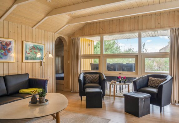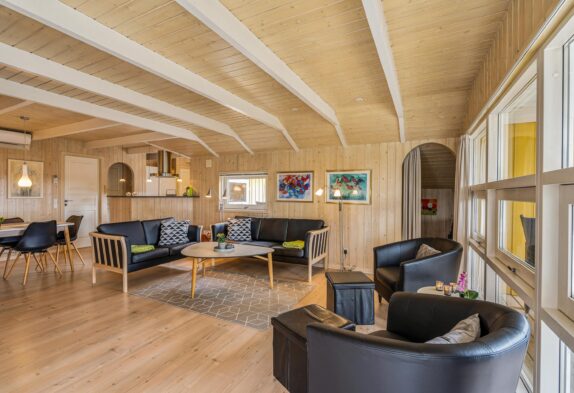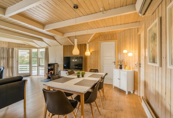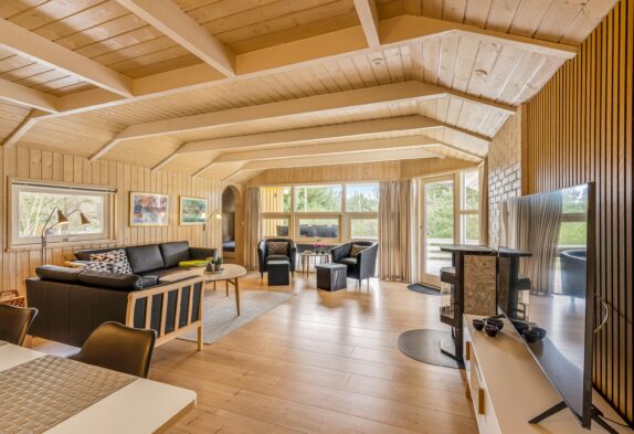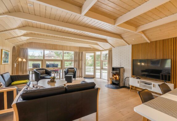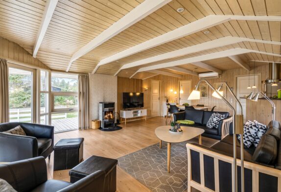 I kan også samles til hyggelige og afslappende stunder med hele familien i sommerhusets alrum. Alrummet forener køkken, stue og spiseplads, så her vil I kunne nyde hinandens selskab, selvom nogle står i køkkenet, og andre slapper af i stuen. Her sørger brændeovnen med sine knitrende flammer for, at feriestemningen er i top.