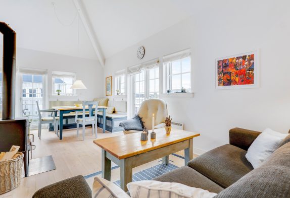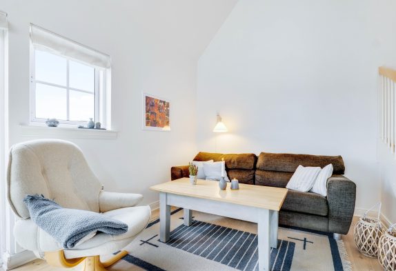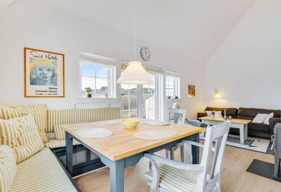 Der er en skøn og smagfuld indretning på Badevej 20 P1, som I mærker, så snart I træder ind ad døren. I kan tilmed høre bruset fra bølgerne. Ferielejligheden er på 90 m2 og byder på en superhyggelig indretning med en integreret stue og spisestue med brændeovn samt badeværelse med gulvvarme, sauna og spa.