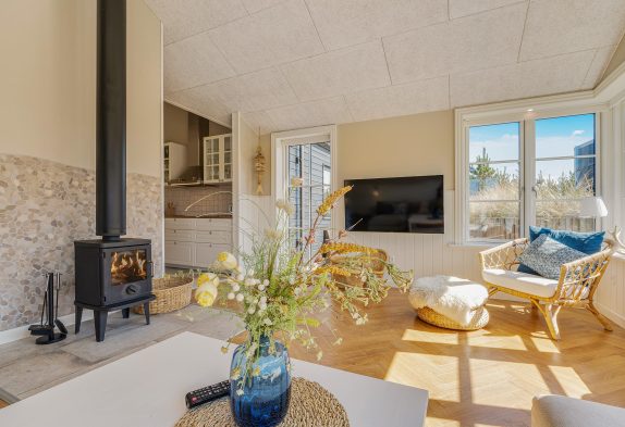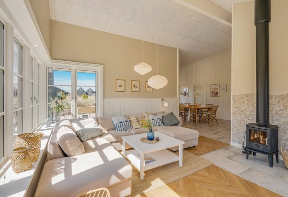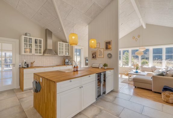 Feriehusets hjerte er uden tvivl det store køkkenalrum. I køkkenet er der rigeligt plads til at samles om madlavningen, mens resten af familien spiller spil ved spisebordet eller slapper af i den komfortable sofa foran brændeovnen. Køkkenet er veludstyret og indeholder både 2 køleskabe, 2 ovne, opvaskemaskine, vinkøler og Nespressomaskine med mælkeskummer.