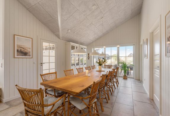 Rent praktisk rummer feriehuset 6 soveværelser med dobbeltsenge og 3 badeværelser – hvoraf et er med puslebord og badekar, så I til hver en tid slipper for kø om morgenen. Tøjvask er også hurtigt klaret med en kombineret vaskemaskine og tørretumbler. Samtidig er sommerhuset også energibesparende, da der er gulvvarme i alle rum.