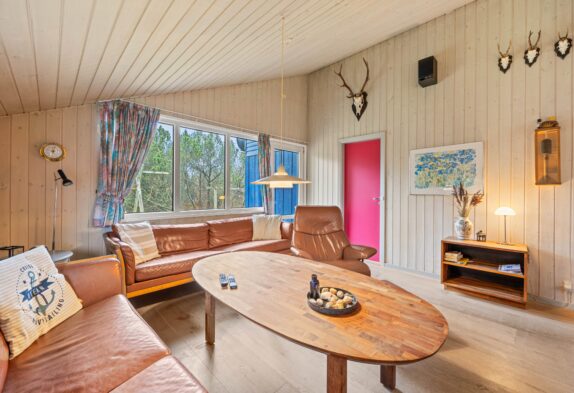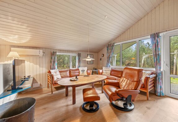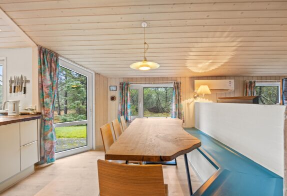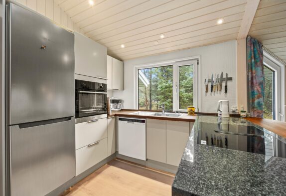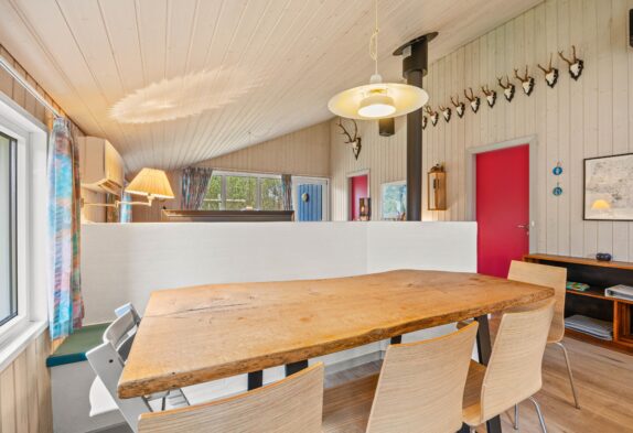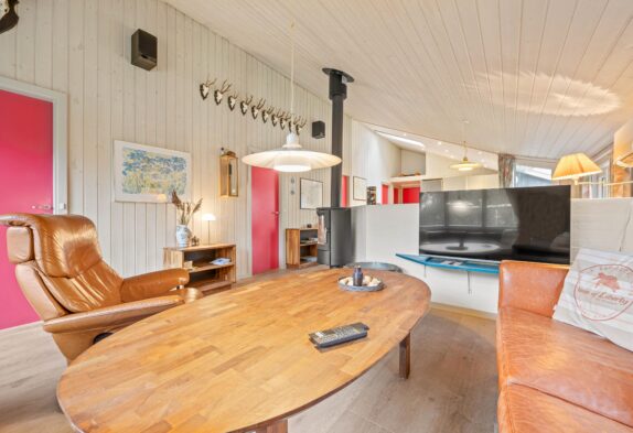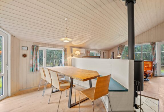 Sommerhusets hjerte er det skønne alrum, der inviterer til mange hyggelige feriestunder for hele ferieflokken. Her kan I samles til lækre måltider eller sjove spil omkring spisebordet, eller I kan sætte jer til rette foran tv’et til en god film – via Chromecasten kan I endda streame jeres favoritfilm! I alrummet står brændeovnen for at fuldende den hyggelige feriestemning med sin knitren og varme.