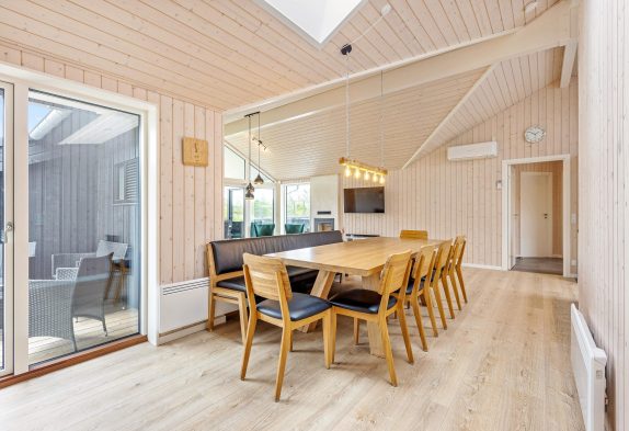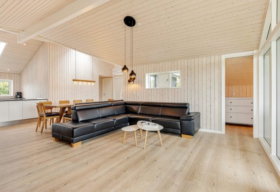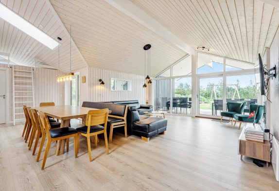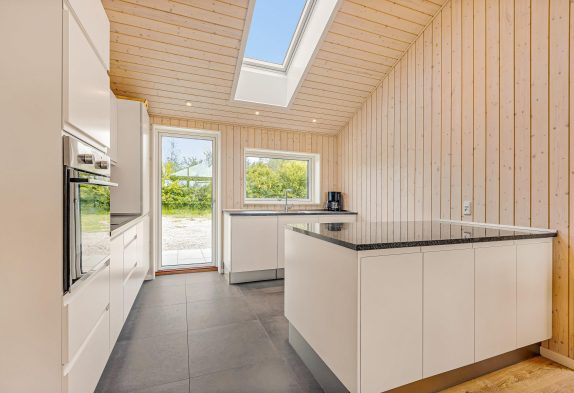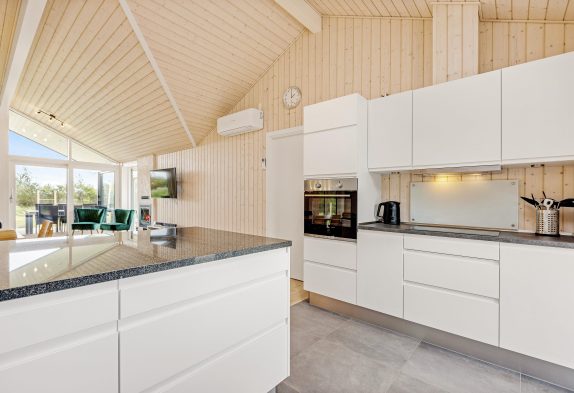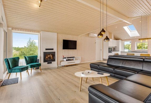 I midten af det typisk danske feriehus finder du den rummelige stue med højt til loftet og ovenlysvindue over køkkenet. Her har du masser af naturligt lys og kan nyde den hyggelige atmosfære. I opholdsstuen finder du også den indbyggede pejs og et fladskærms-tv til hyggelige aftener med en spændende film og godt selskab. Derudover kan du også opvarme dette skønne feriehus med den energibesparende varmepumpe.