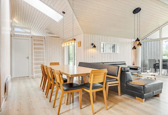 Den tilstødende spiseplads er velegnet til mange hyggelige timer med bræt- eller kortspil med hele familien, og køkkenet er udstyret med opvaskemaskine, mikrobølgeovn, køleskab og en 70l fryser – alt sammen i høj kvalitet – hvilket indbyder til fælles madlavning.